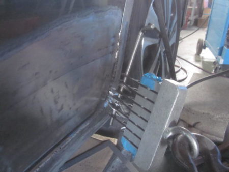 ▼ クオーターパネルの凹み傷も同様に凹みの酷い箇所に複数のピンをスタッド溶接して専用の治具を用いて引き出して修正をかけます。