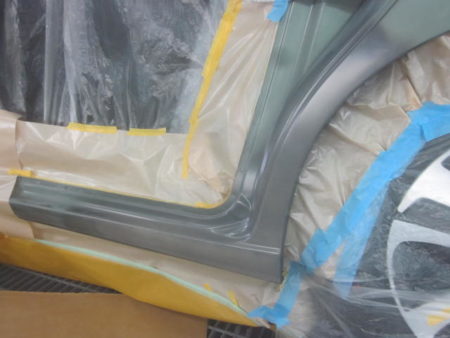 ▼ 修正が済んだクオーターパネルとステッププロテクターはパテを盛り付けて整形を行い、研磨を数回繰り返して平滑に仕上げます。