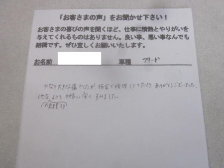 ※ こちらのお客様の修理感想はこちら ⇒ホンダ・フリード