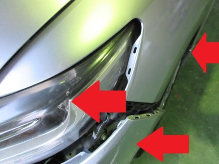 先ずフロントバンパーへの衝撃が強く結構大きく凹んでしまっています。ヘッドライトも割れている状態です。