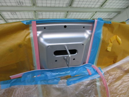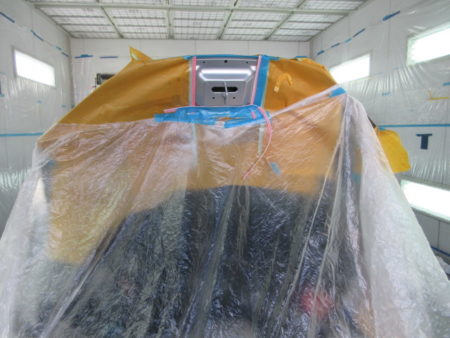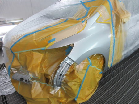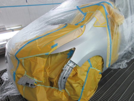 塗料の食いつきを良くする「足付け」という作業や、塗装面の油汚れやワックス分をしっかり落とす「脱脂」も行い、塗装面以外を塗料の飛散による汚れを防止する為のマスキングを専用のシートで丁寧に行ってから塗装に入ります。