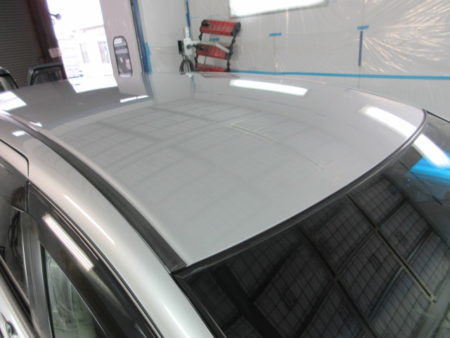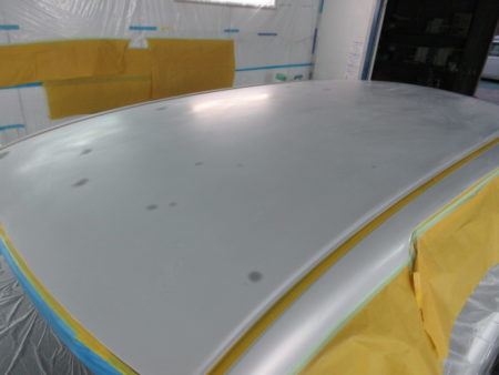 ルーフ以外のフロントガラス面やドアガラス面などマスキングをしてから足付けの後にワックスオフで脱脂をします。