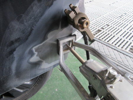 ▼ 先ずスライドドアとクオーターパネル擦り傷部分をサンディングで削って地肌を出します。ドアとクオーターパネルは裏側から叩き出して凹みを修正することが出来ないのでスタッド溶接でピンを溶接して専用の治具を取付けて、引き出して凹みの修正をします。