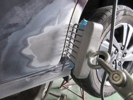 ▼ クオーターパネルの凹み箇所に複数のピンを溶接して引き出していきます。