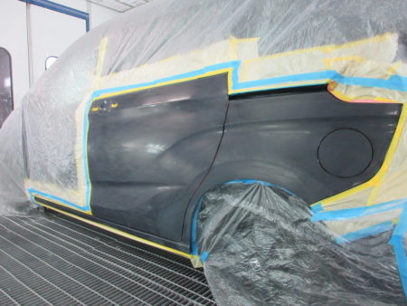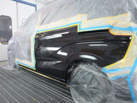 塗装の前に、塗装面の足付けと塗装面の油汚れやワックス分をしっかり落とす脱脂を行い、塗装面以外を塗料の飛散による汚れを防止する為に専用のシートでマスキングを行います。