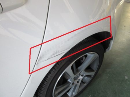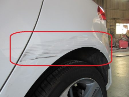 ▼ 左リアドアの傷は大した傷ではないので磨いて修正します。
