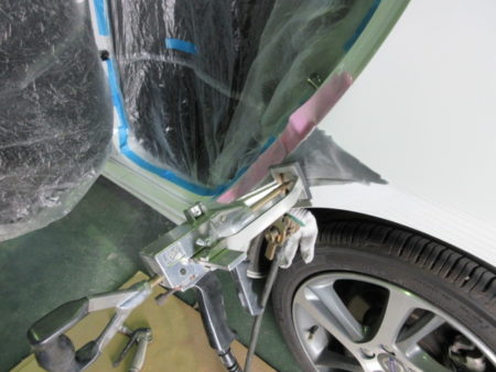 ▼ クオーターパネルの傷は傷部分をサンディングで削って地肌を出してそこにスタッド溶接でピンを溶接して専用の治具を使い引き出して修正します。