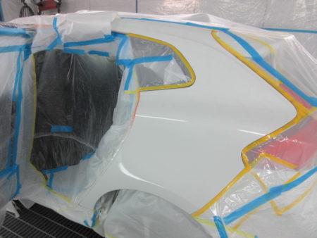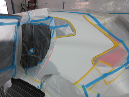 ▼ 塗料がかからないように周囲を丁寧にマスキングで保護してから、下地処理の為のサフェーサを塗布します。サフェーサの効果は鈑金仕上げに使うパテが塗料を吸い込まない等にしっかりシールし、塗装面を滑らかにします。さらに防水・防錆の効果もあります。