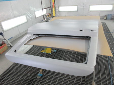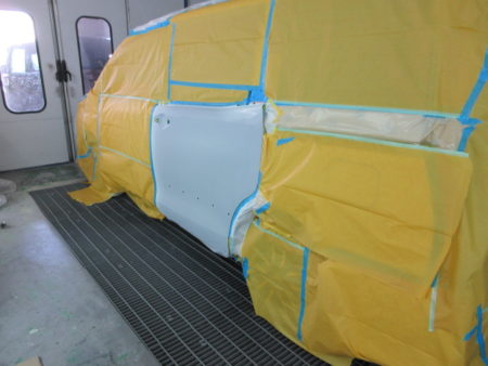 ベテランの塗装職人により現車の色に合わせた調色をし、一度にべったり塗装せず数回に分けて塗料を馴染ませながらサフェーサが完全に隠蔽されていることを確認しながら塗装を行って行きます。