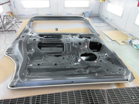 ▼ 新品のリアドアが入庫しました。新品のドアは非常に高い防錆力を持つ電着塗装が施された状態で供給されます。(殆んどの場合黒い塗装膜)なので現車の色に合わせて塗装をします。