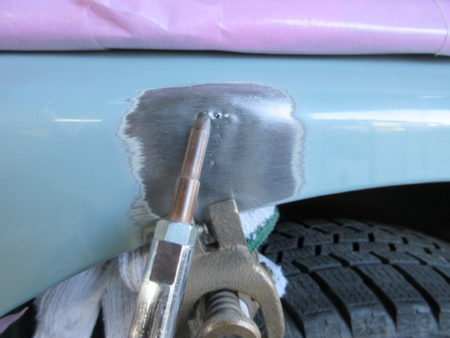 ▼ 先ず、クオーターパネル損傷部分をサンディングで削って地肌を出します。スタッド溶接でピンを溶接して専用の治具を取付けて、引き出して凹みの修正をします。