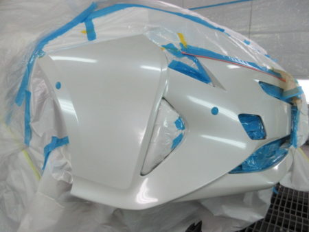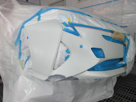 ▼ 下地処理の為のサフェーサを塗布し、塗装面の油汚れやワックス分をしっかり落とす脱脂も行います。