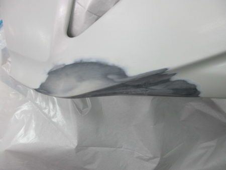 ヘコミの箇所はプーリングで引き出し、裂けめ部分を平滑にしてパテを盛り付けて修復します。