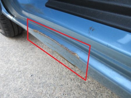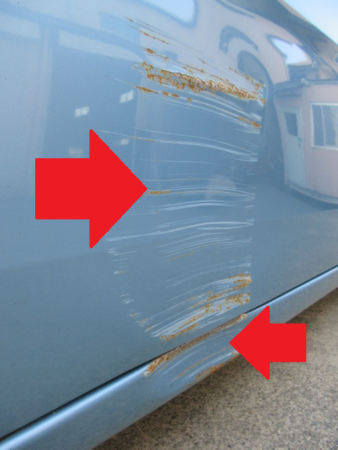 ▼ フロントドアとロッカーパネルにすり傷と凹み傷が見られました。時間が経過していて錆の発生も見られました。