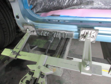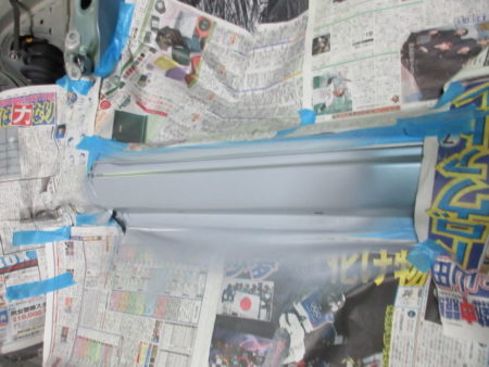 フロントドアは新品と交換し、ロッカーパネルは交換レベルの損傷でしたが修理で対応することとなりました。
