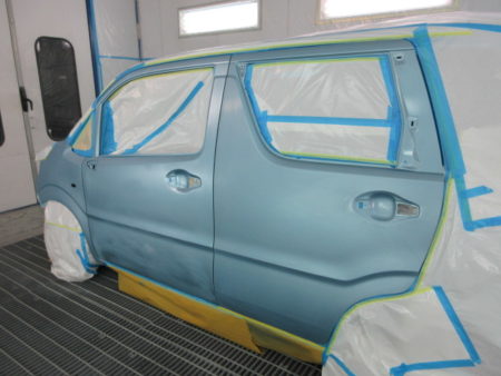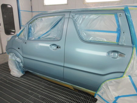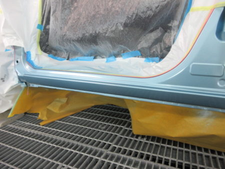 ▼ 車を塗装専用ブースに移動して、塗装を行って行きますが塗装面以外の塗料がかかってはまずい個所を専用のシートでマスキングをして塗料の飛散による汚れを防止します。